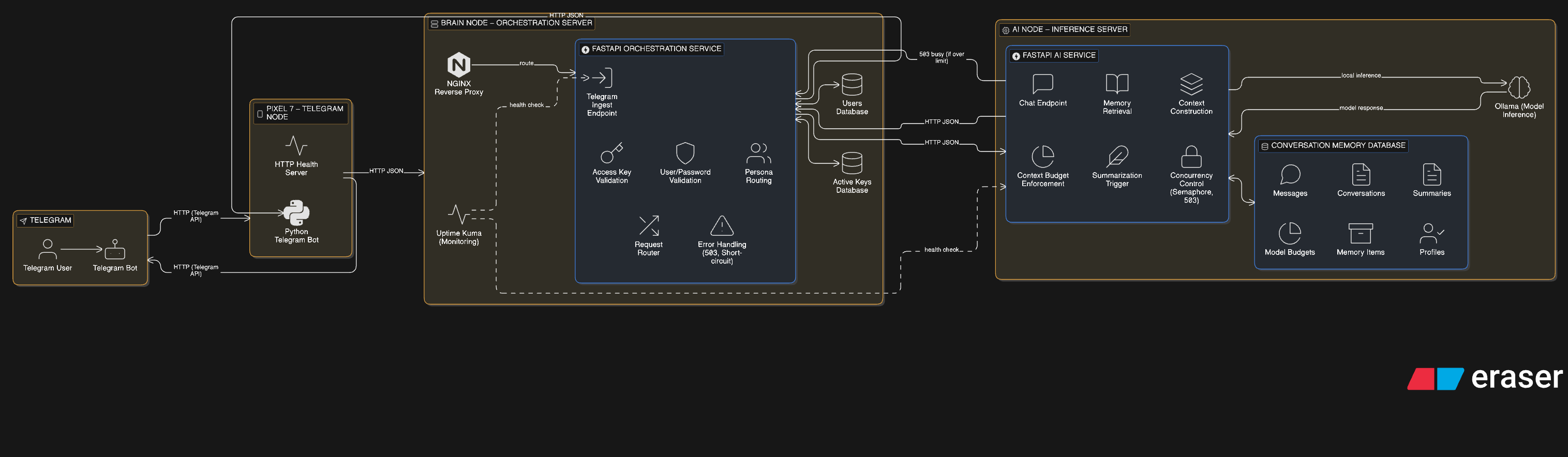 The platform is structured as a multi-node system with clearly separated responsibilities. A Telegram bot running on an Android device (Pixel 7, via Termux) acts as the user-facing interface. Messages are forwarded to a central orchestration server ("brain node," as I refer to it), which validates requests, manages conversation context, and routes inference requests to a dedicated AI node. Responses return through the same path to the Telegram client.