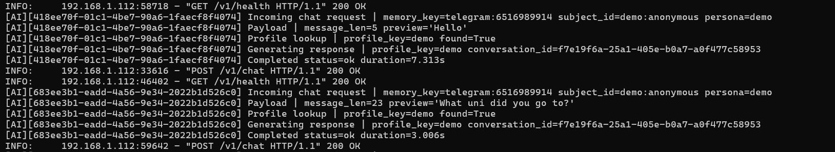 I became interested in increasing the complexity of the system by separating inference, orchestration, and user interaction across multiple machines. Messaging platforms such as Telegram provided an appealing direction: they act as lightweight frontends, expose well-documented APIs, and integrate naturally into everyday communication. Integrating Telegram was therefore both a technical challenge and a practical experiment in building a system that could operate within a real-world messaging ecosystem rather than a controlled browser environment.