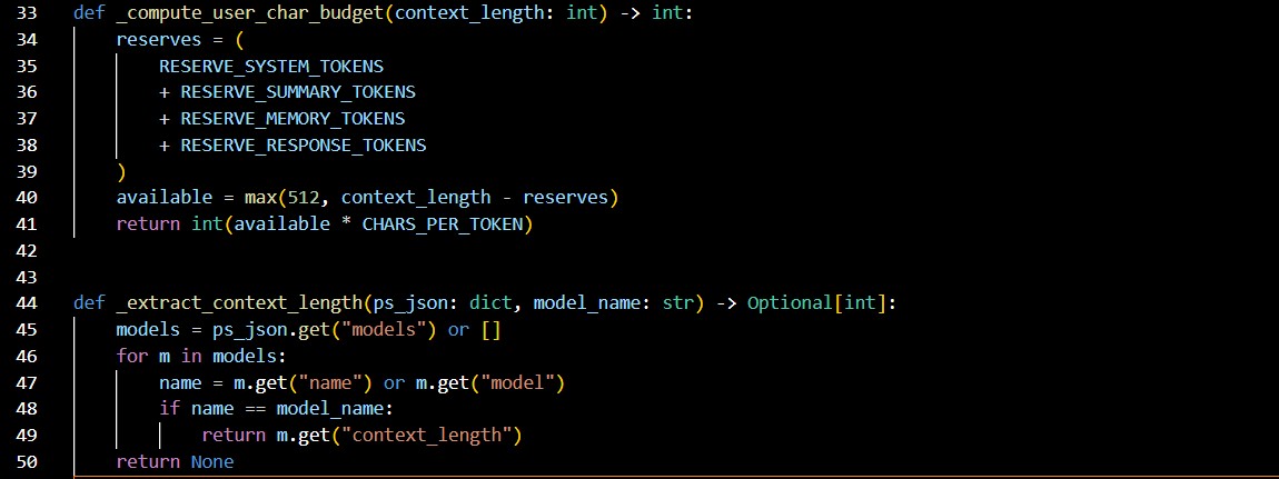 Conversation memory was designed around explicit identities and contexts rather than a single global history. Each interaction is associated with a persona, subject identifier, and memory key, allowing multiple users and conversational contexts to coexist safely. Context windows are constructed dynamically using a character-budgeting approach rather than a fixed message count, ensuring predictable memory usage across different models with varying token limits.