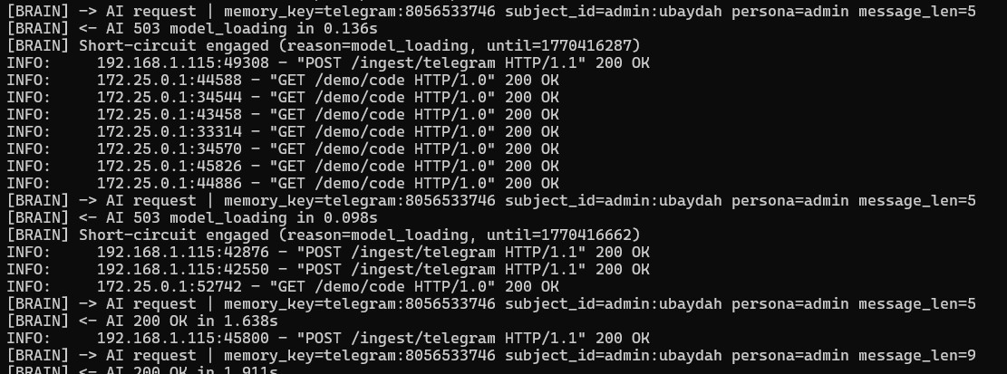 To keep behavior predictable under load, the brain node performs readiness checks and can short-circuit requests when the model is unavailable. Logs are emitted at each hop, making it possible to trace routing decisions, gating outcomes, and the generation lifecycle across machines.