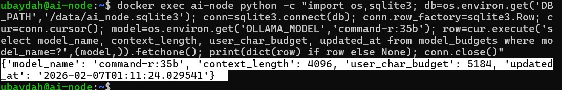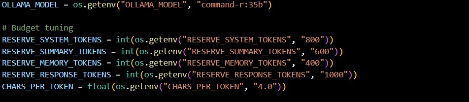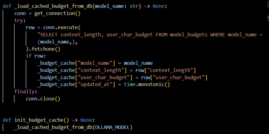 Internally, the system maintains model-specific context budgets. When a model is loaded, its approximate context capacity is estimated by querying the inference service and calculating a character-based budget. Conversation history is managed against this budget, and when limits are exceeded, summarisation is triggered and persisted, allowing long-running conversations to continue without exceeding model constraints.