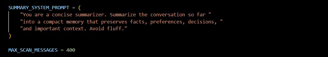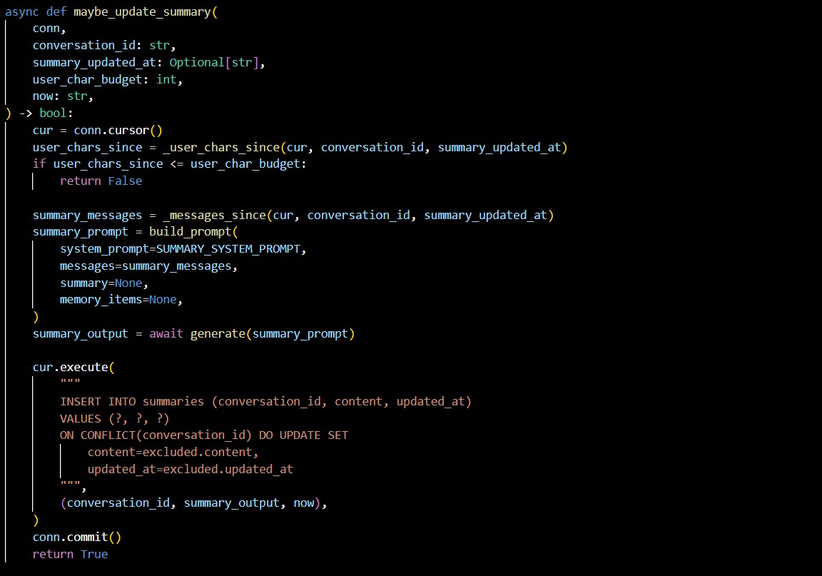 Conversation memory was designed around explicit identities and contexts rather than a single global history. Each interaction is associated with a persona, subject identifier, and memory key, allowing multiple users and conversational contexts to coexist safely. Context windows are constructed dynamically using a character-budgeting approach rather than a fixed message count, ensuring predictable memory usage across different models with varying token limits.
