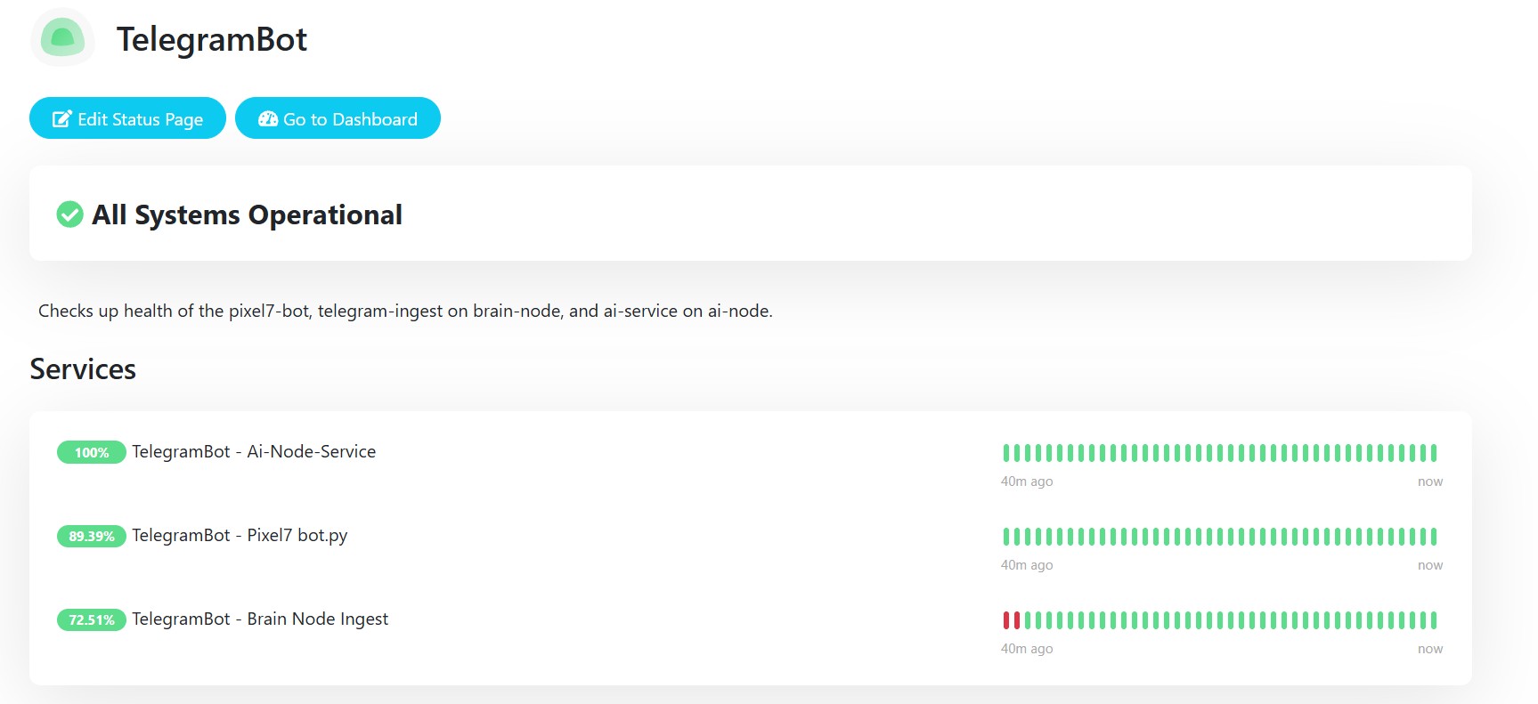 Telegram turned out to be an interesting interface to build against. The Bot API is well documented, and being able to inspect requests and responses in detail made it easier than I expected to understand what was happening at each step. Running the bot on an Android device also made the system feel closer to a real service rather than a prototype, since it was always available and reachable in the same way a normal messaging app is. Observability became an important part of the system as it grew. I added a small HTTP health server directly inside the bot so that Uptime Kuma could monitor it, and because the system was distributed I could monitor the bot, the orchestration layer, and the inference service independently. That monitoring data is even surfaced on the live demo page, which helped turn operational tooling into part of the user-facing experience.